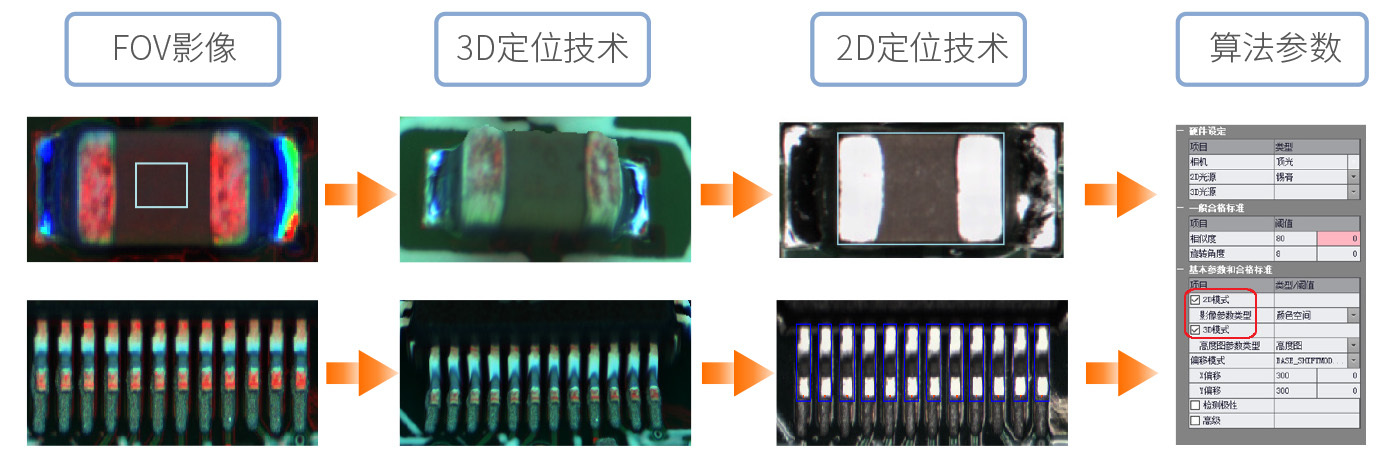 3DAOI采用3D本體定位技術(shù),2D定位技術(shù)作為輔助,保證Chip 與IC等元器件的本體與PIN腳定位準確及黑色等特殊元器件的本體定位準確。
